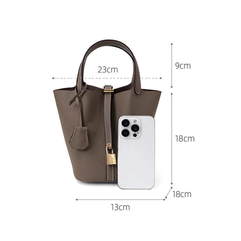 Crafted from premium first-layer Togo leather with PU lining, this elegant basket bag features a main compartment, secondary pocket, and two slip pockets. Finished with a sophisticated metal lock and durable electroplated hardware, it combines style, functionality, and optional personalization—perfect for everyday use or gifting.